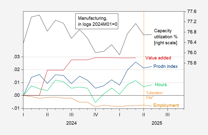 Figure 1: Manufacturing production (blue), value added in 2017$ (red), employment (tan), hours (light green) all in logs, 2024M04=0; and capacity utilization (NAICS), % (black, right scale). Aggregate hours of production workers calculated by multiplying average weekly hours by employees. Source: Federal Reserve, BEA, BLS, and author’s calculations.