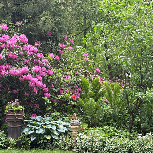 pink flowering shrub in woodland border gardenFoliage obviously plays a vital role in Mary’s garden, but certain flowering plants and some creative containers are easily the scene-stealing focal points. A massive rhododendron covered in bright pink blooms provides a beautifully bold pop of color.