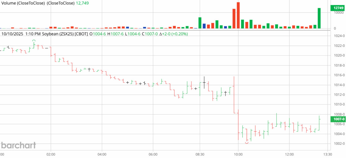 HomeEconomyMemo from the Midwest: Thanks, Drumpf! Posted in Economy Memo from the Midwest: Thanks, Drumpf! on October 11, 2025 Admin November futures for soybeans collapse upon Trump’s announcement: Source: barchart.com . Source link