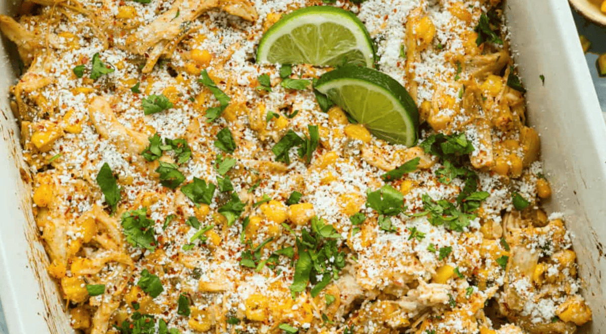 This Mexican Street Corn Chicken Casserole takes everything you love about elote, tangy lime, smoky Tajin, sweet corn, and creamy cotija, and turns it into one bubbly, cheesy weeknight dinner the whole family will devour!