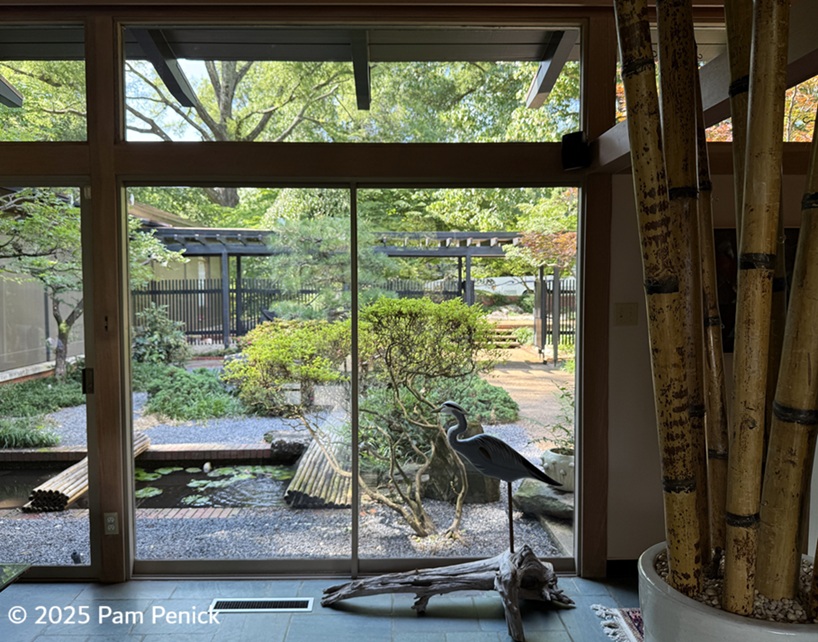 Along a wall of windows, a rectangular pond adds the tranquil sight of water. Rolled bamboo covers rest on the brick edging. Are these to keep out raccoons and herons at night, I wondered?