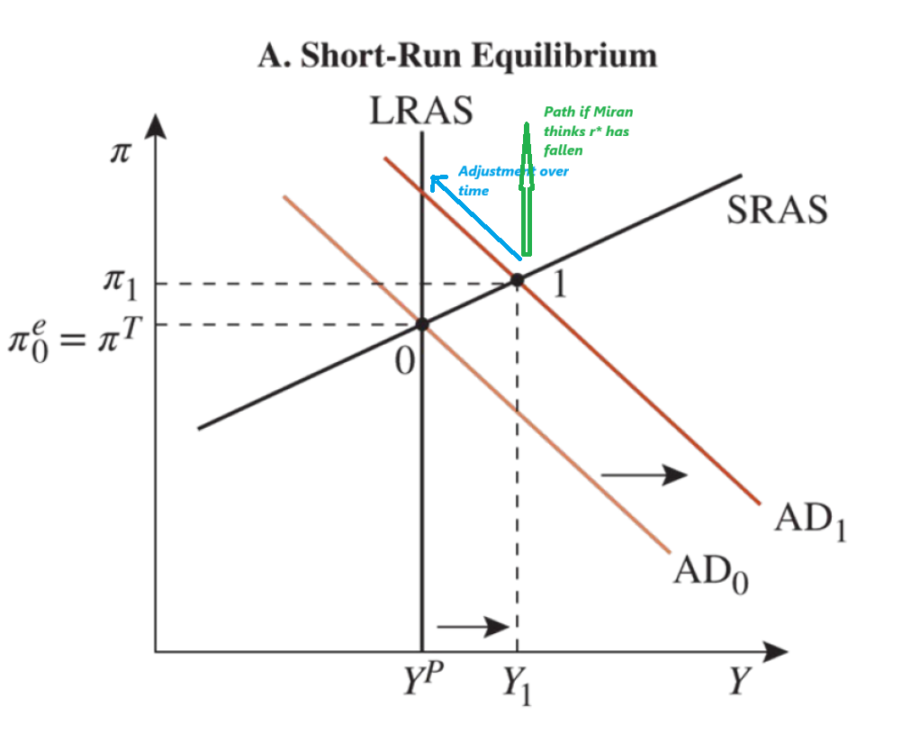 So, say r* has risen (rather than fallen as Miran argues); then to push for lowering interest rates means Miran has to be implicitly arguing for a higher target inflation rate, πT. Any ol’ New Keynesian model with a money reaction function and a Phillips curve will get you that. (For a quick refresher, look at this derivation I compiled for my students, based on the Cecchetti-Schoenholtz exposition).