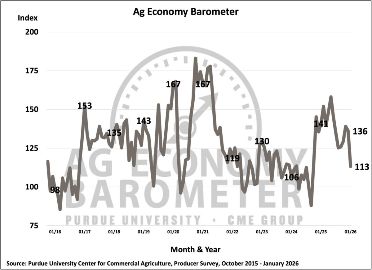 Among the five indices that make up the AEB Index, the largest decline was in the question asking participants whether U.S. agriculture would have good times or bad times in the next five years. The index for this question fell from 122 to 88, marking its lowest point since September 2024. Respondents also expressed greater concerns about agricultural exports compared to last month.