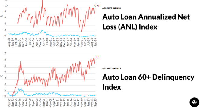 We would’ve gotten Q3 advance GDP yesterday, and September personal income and outlays today, ordinarily. What indicators do we have for the state of the macroeconomy? Here’s one: delinquincies on auto loans (for pools of asset backed securities).