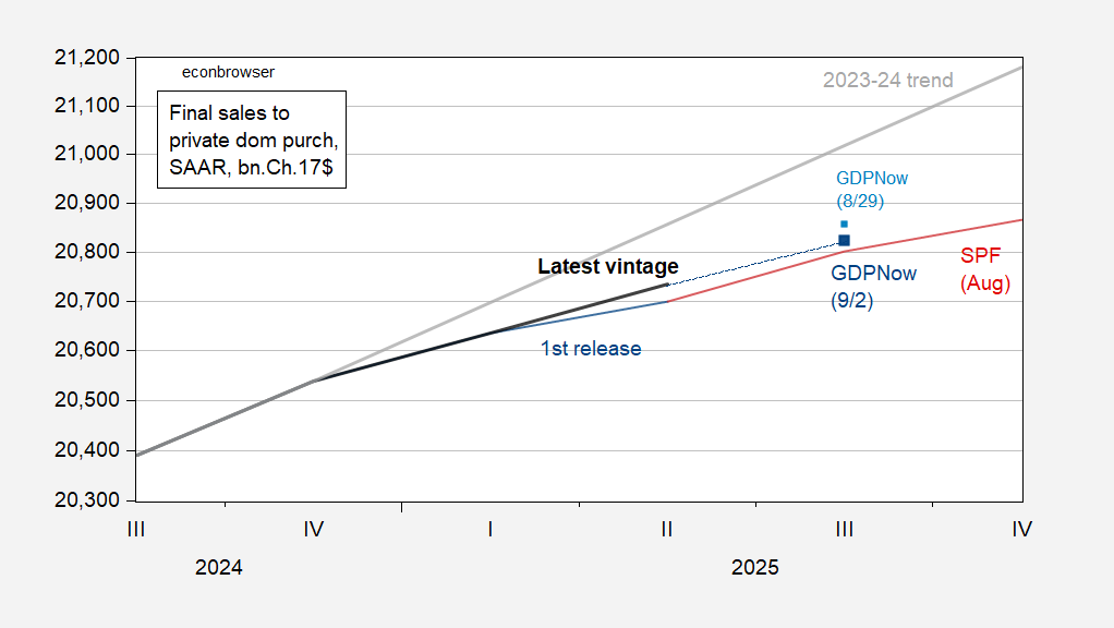 Figure 1: Final sales to private domestic purchasers, latest vintage (bold black), advance release (blue), GDPNow of 8/29 (light blue square), GDPNow of 9/2 (dark blue square), Survey of Professional Forecasters August median (dark red), 2023-24 stochastic trend (gray), all in bn.Ch.2017$ SAAR. Source: BEA, Atlanta Fed, Philadelphia Fed, and author’s calculations.