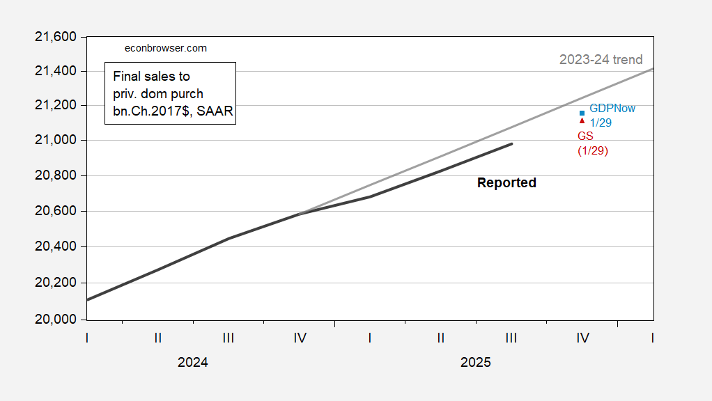 Figure 1: Final sales to private domestic purchasers (bold black), 2023-24 stochastic trend (gray), GDPNow of 1/29 (light blue square), Goldman Sachs of 1/29 (red triangle), all in bn.Ch.2017$ SAAR. Source: BEA 2025Q3 updated release, Atlanta Fed, Goldman Sachs, and author’s calculations.