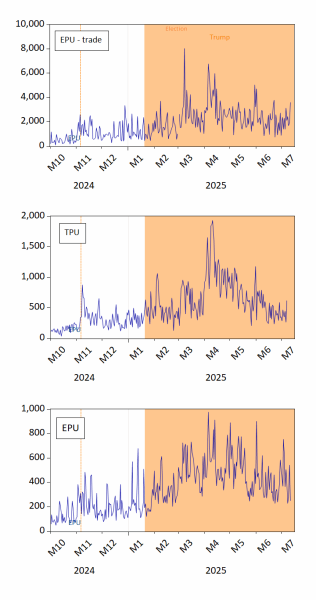 Figure 1: Top panel, EPU-trade; Middle panel: Trade Policy Uncertainty; Bottom panel: EPU. Orange shading denotes second Trump administration. Orange dashed line denotes election. Source: policyuncertainty.com, Iacoviello et al.
