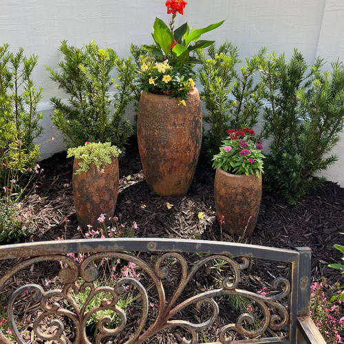 trio of tall containers with tropical plantsA trio of rustic pots also has a distinct Mediterranean feel, with some colorful tropical plants giving them a Florida garden twist. A rusty garden bench in front continues this aesthetic and makes for a great place to enjoy the garden.