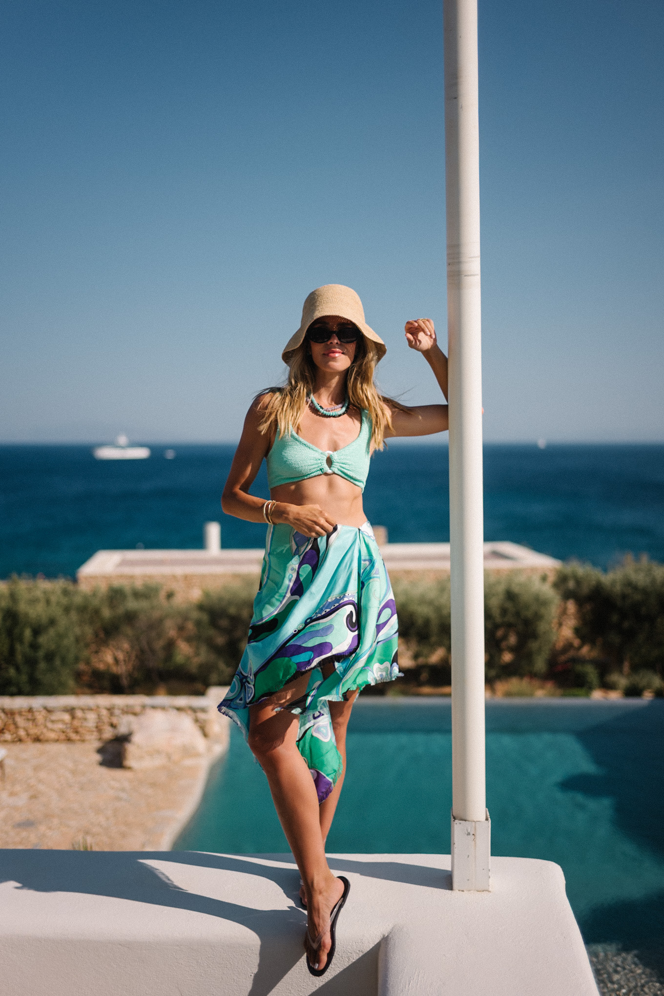 Hunza G Bikini, Pucci Skirt (sold out, similar style here), Janessa Leone Hat, Similar Necklace, Christopher Esber Sandals, Saint Laurent Sunglasses