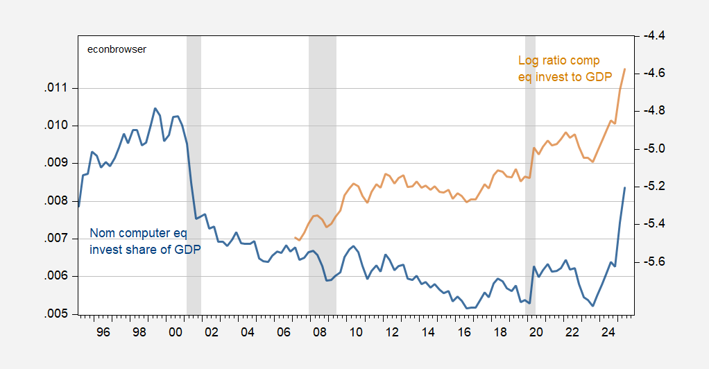 First, here’s a picture of computer equipoment capital investment over time, as a nominal share of GDP and log ratio of real quantities.
