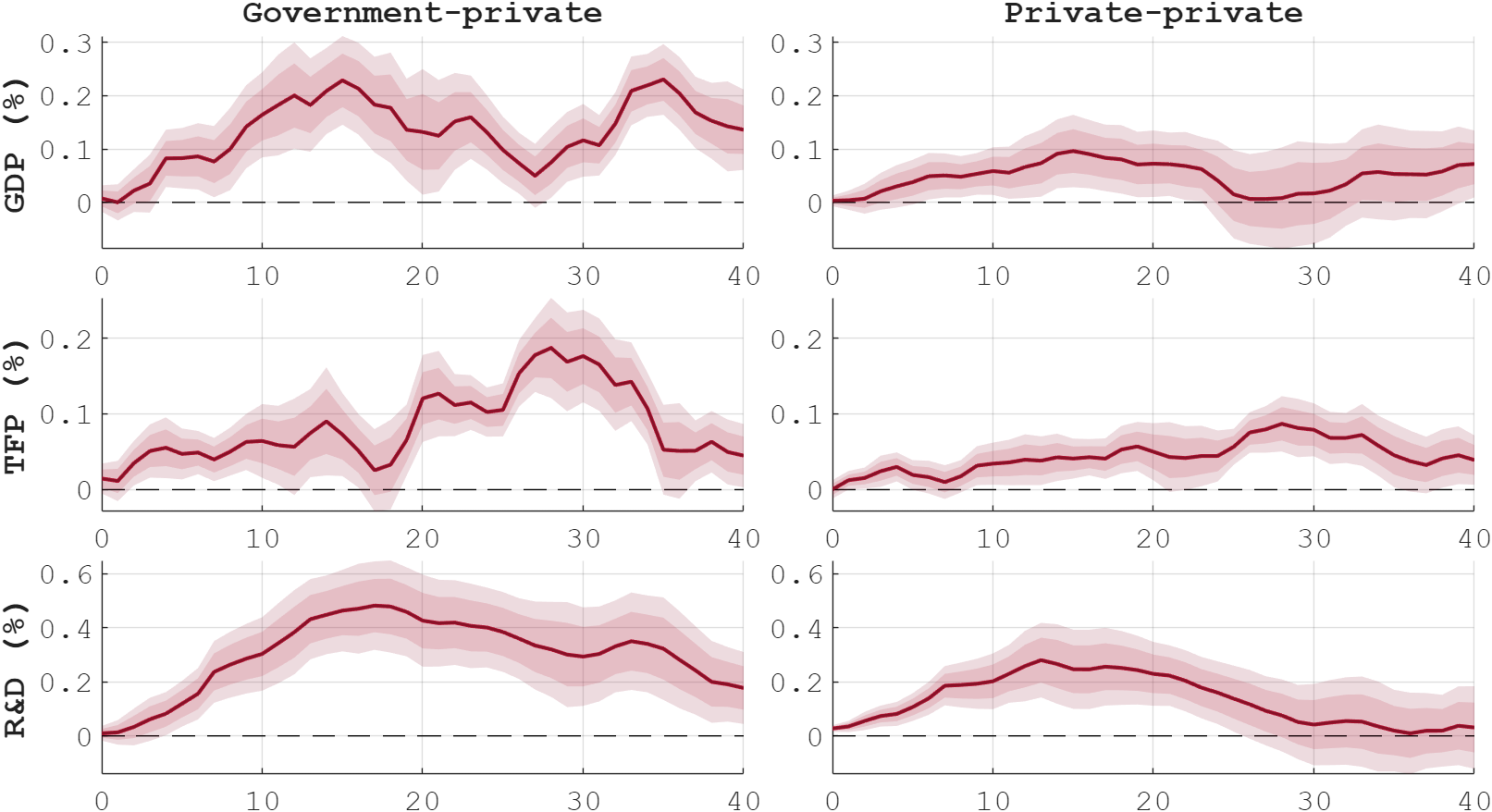 Notes: The figure displays the dynamic effects of innovation shocks in each category of patents (public-private, private-private, public-public; by column) on (log) real per-capita private GDP and (log) TFP. The estimates are done by means of local projections, where the size of the shock is normalised such as to increase total patents by 1% on impact. Shaded areas report 68% and 90% confidence intervals. Sample: 1950:Q1-2015:Q4.