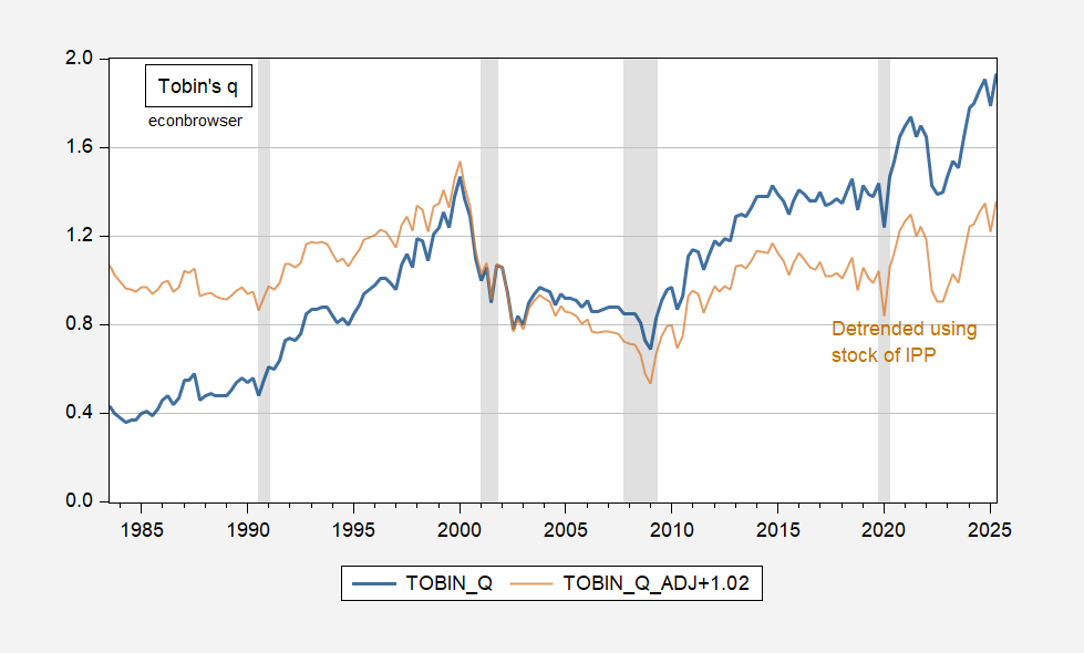 In 2025Q2, detrended q is then lower than it was in 2000Q1 (1.35 vs. 1.54). I’d like to say this means the market’s valuation of the capital stock is not excessively high, but in actuality detrending using log stock of IPP is pretty close to linear (deterministic) detrending, and this is a dangerous thing to do when q looks like an I(1) process (one can’t reject the null hypothesis of unit root).