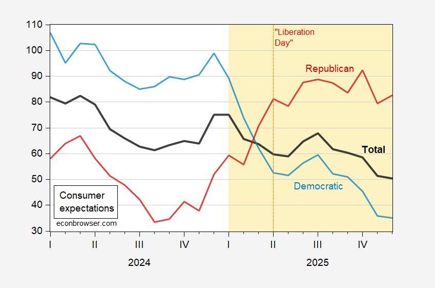Figure 1: U.Michigan Survey of Consumers Consumer Expectations, Overall (bold black), Democratic/lean Democratic (blue), Republican/lean Republican (red). Source: U.Mich.