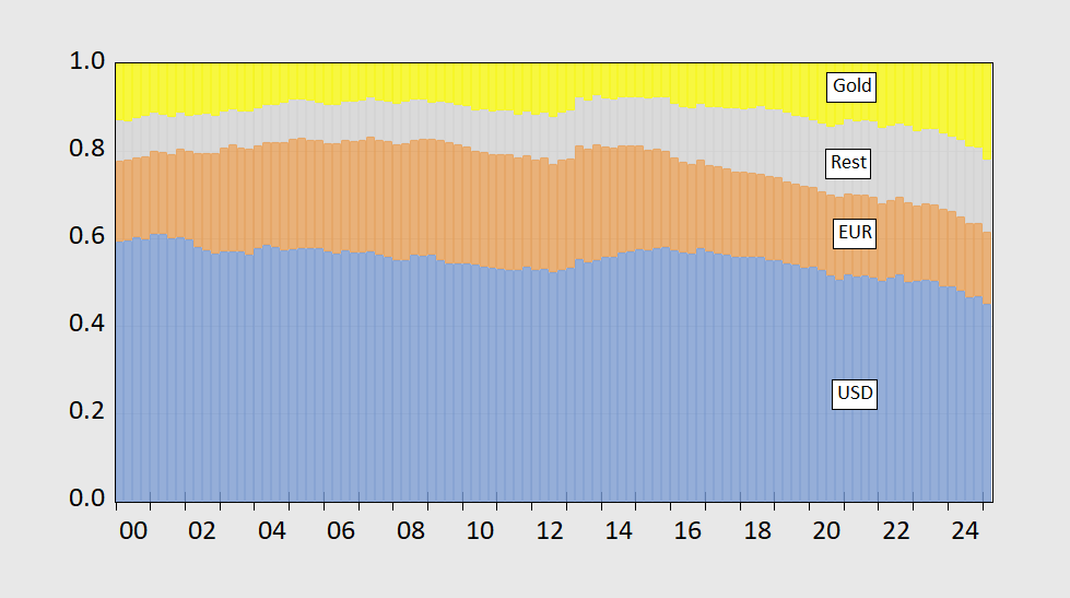 Figure 1: USD shares of fx and gold reserves (blue bars), EUR (tan), all other (gray), and gold (yellow). USD(EUR) share assumes 60%(35%) of unallocated reserves are in USD(EUR). Assumes quantity of gold holdings stay constant in 2025Q, and observed . Source: IMF COFER, World Gold Council, and author’s calculations.