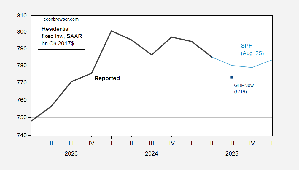 Figure 1: Residential fixed investment (bold black), Survey of Professional Forecasters August median f’cast (light blue), GDPNow of 8/19 (dark blue square), all in bn.Ch.2017$, SAAR. Source: BEA 2025Q2 advance, Philadelphia Fed, Atlanta Fed, and author’s calculations.