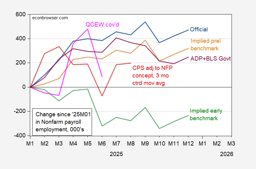 Figure 1: Cumulative change in nonfarm payroll employment from BLS CES-official (blue), implied benchmark release (tan), implied early benchmark (green), from CPS measure adjusted to NFP concept, smoothed population controls, 3 mo centered moving average (red), QCEW total covered seasonally adjusted by author using Census X-13 in logs (pink), and ADP private plus BLS government employment (purple), all in 000’s, s.a. Source: BLS and ADP via FRED, QCEW, Philadelphia Fed, and author’s calculations.