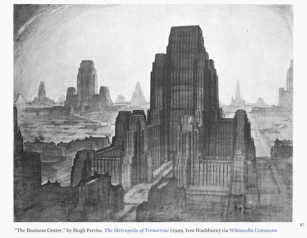 “Detroit. The David Stott Building,” by Hugh Ferriss, The Metropolis of Tomorrow (1929, Ives Washburn) via Wikimedia Commons