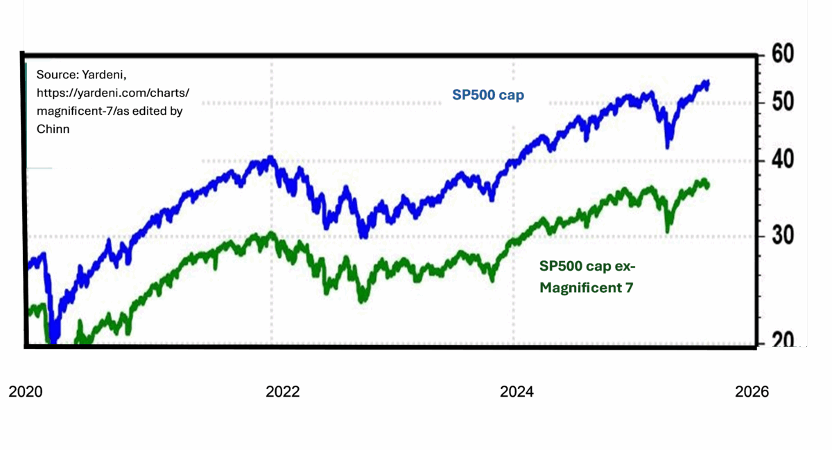 In terms of assessing how the general economy is responding to tariff and other uncertainty shocks, one might want to look at the SP500 excluding the Magnificent 7. As of August 8, SP500 market cap was $54.2 trillion; ex-Magnificent 7 was $36.7 trillion.