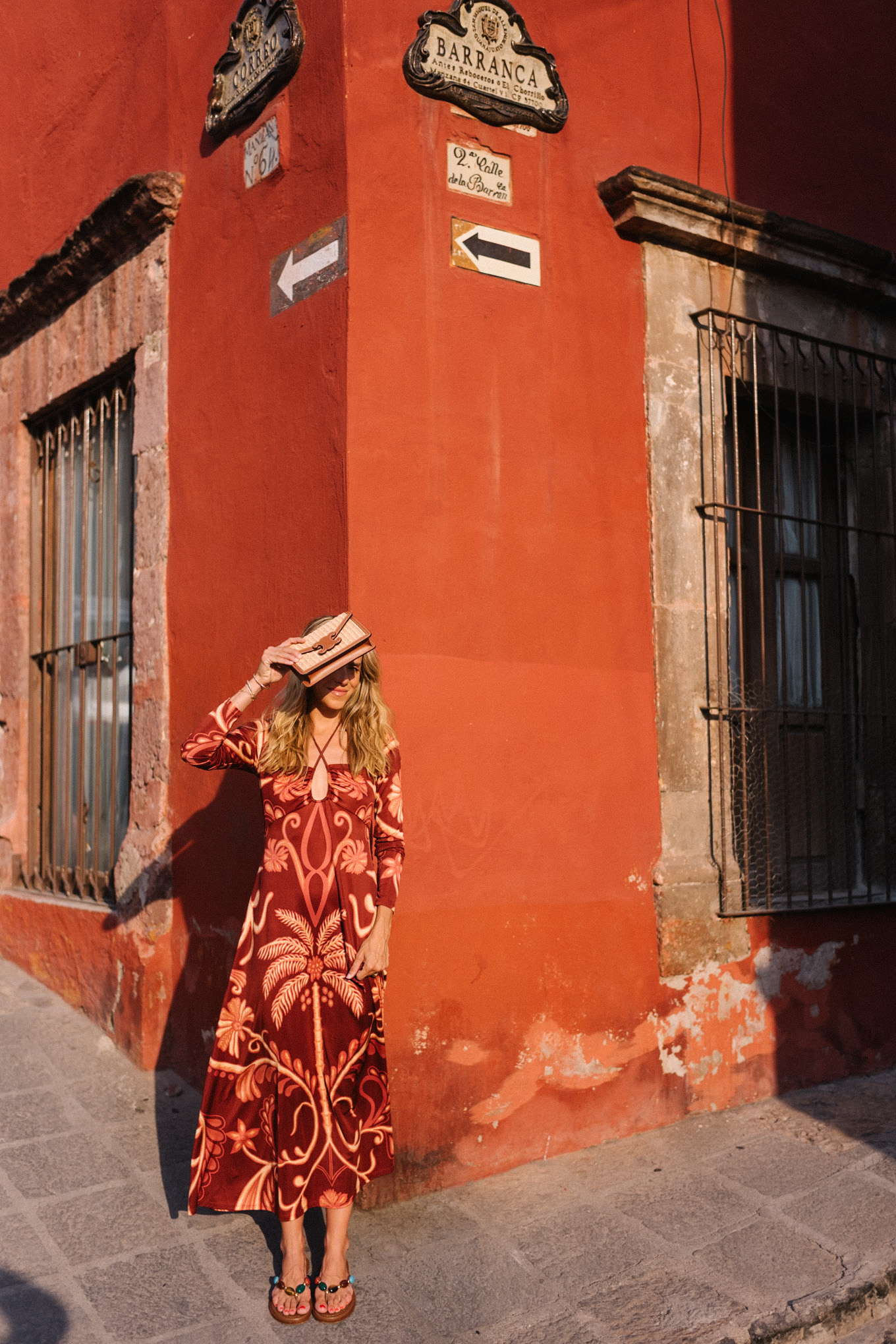 Johanna Ortiz Dress (love this one and this one on sale), Gianvitto Rossi Sandals (heeled version here), Similar Bag Here and Here