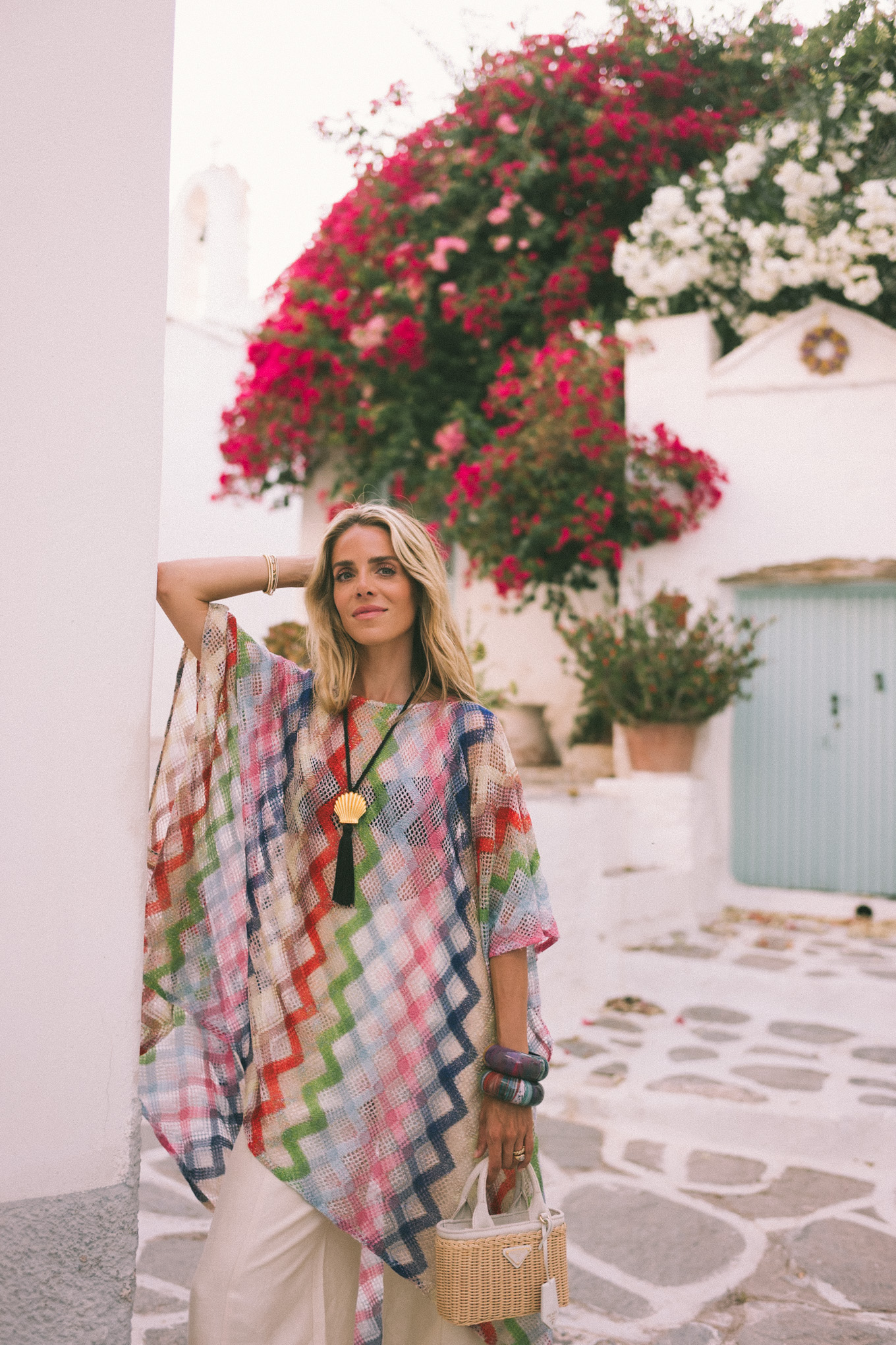 sheer rainbow crochet tunic cream silky pants basket bag black seashell necklace