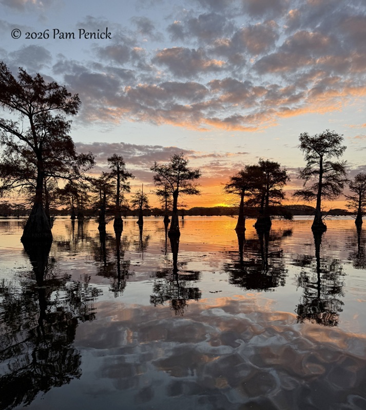 Sunrise sky over Caddo Lake, with birds and bald cypress