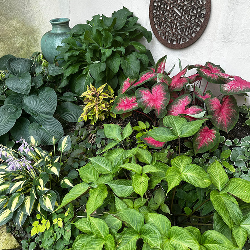 Along with being a talented gardener, Syd is an accomplished sculptor and ceramics artist (You can check out some of her incredible work on her website) who made many of the amazing pots and eye-catching garden art found in her landscape. While this gorgeous bed of bold and colorful foliage plants is sensational on its own, her eye for artwork brings another level of personality to her designs.
