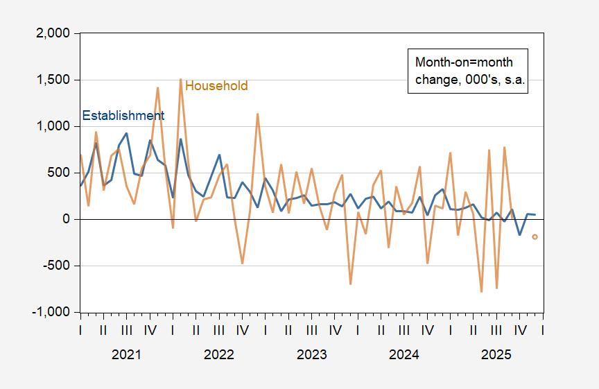 As I noted back in August 2024, this is a sort of “Great Replacement” screed (I won’t validate it by calling it a theory) which has no place in proper economic discourse. But even more importantly, Antoni is ignoring the issues with the CPS employment series — in particular the population controls used — which invalidate his assertion regarding foreign born/native born employment trends during 2022-24 (see Edelberg and Watson, 2024).
