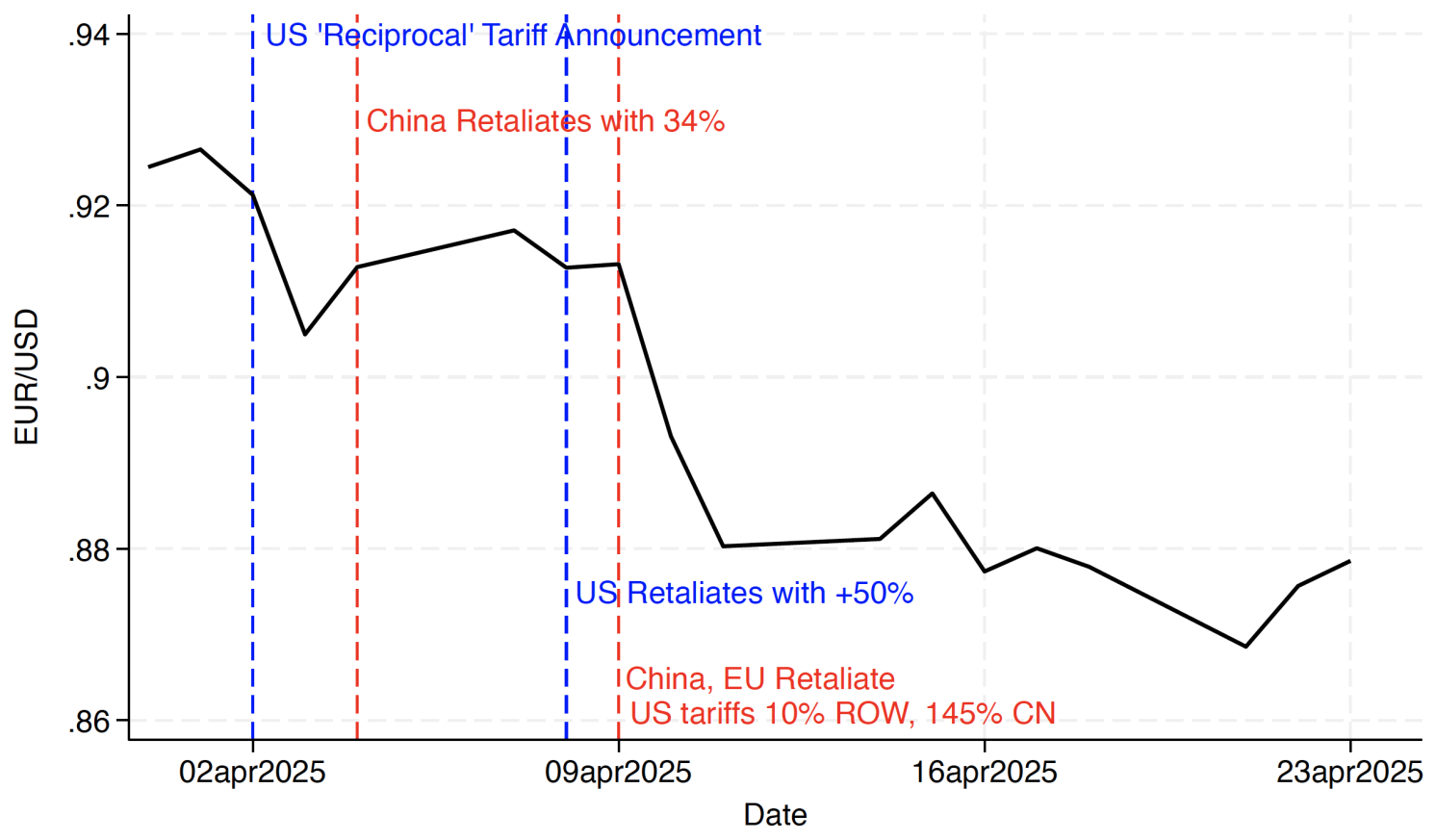 As argued above, theory and evidence suggest that when a country initiates a tariff exchange, prompting widespread expectations of retaliation, its currency may not strengthen. In this sense, the US dollar’s depreciation in April 2025 is not surprising.