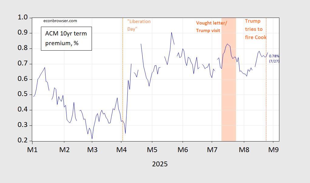 Figure 1: Ten year term premium, in % (blue). Light orange shading denotes period between Vought letter to Powell and Trump’s visit to Fed. Source: NY Fed.