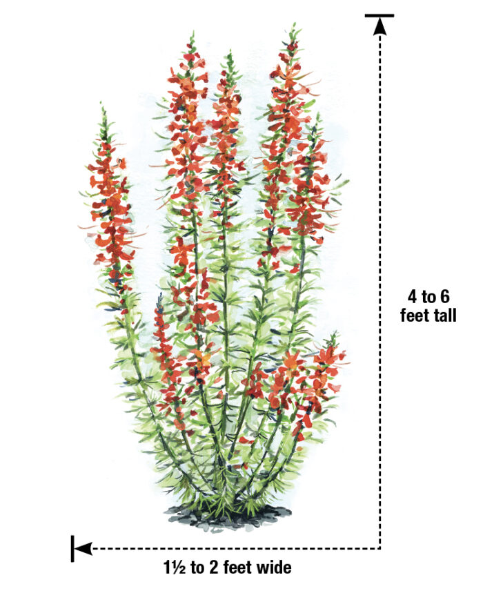 This plant is deer and rabbit resistant, attracts butterflies and hummingbirds, tolerates challenging soil types, and is delightfully colorful. It might sound too good to be true, but Texas plume has it all. Native to much of the Gulf Coast, central Texas, and Oklahoma, this plant is sure to draw attention from gardeners and wildlife alike. Towering 4 to 6 feet tall in some situations, Texas plume bursts open in late spring through midsummer with tubular blooms that are often the shade of scarlet lipstick. Feathery, fine-textured leaves and a vertical habit add to its charisma.