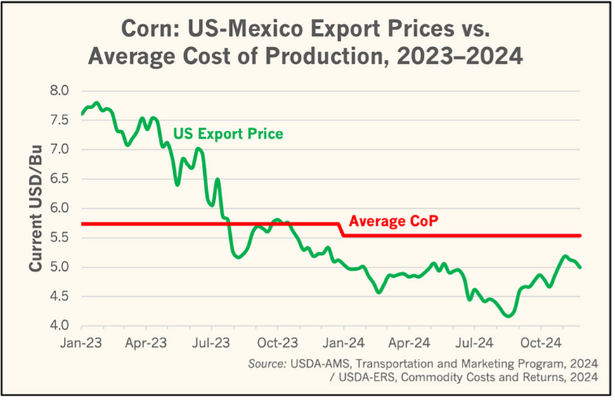 One of the biggest victims is Mexico. Over the years, the Institute for Agriculture and Trade Policy has published reports tracking the incremental harm US dumping of basic agricultural staples has done to Mexico’s ability to feed itself. From its 2023 report, Swimming Against the Tide: Mexico’s Quest for Food Sovereignty in the Face of U.S. Agricultural Dumping: