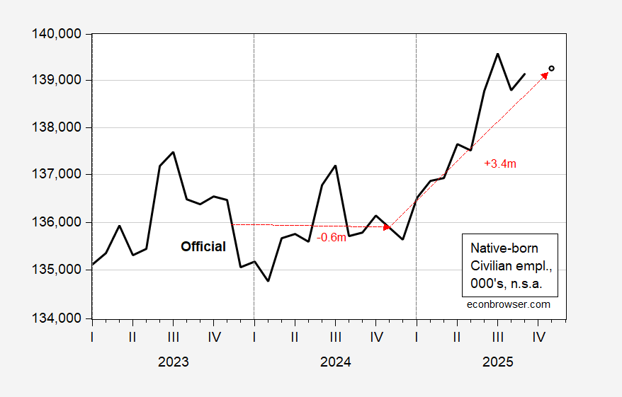 If one looks at Figure 2, without understanding the way in which the civilian employment series is calculated, then one might think there was an “astonishing” jump in employment in Jnauary 2025. The fact is that each year, new population controls are implemented; when the controls differ substantially from the preceding (or succeeding) year, then jumps — that are purely statistical artefacts — can be exhibited. Understanding this debate (which was quite prominent in 2024) induced the BLS to implement on a experimental basis alternative, “smoothed”, population controls. These alternative calculations yield the tan line in Figure 2. As is shown, instead of the +2.6 million increase, one obtains +0.9 million, y/y through November. While Antoni doesn’t cite overall increase, he should understand similar concerns apply to the level of native-born and foreign-born employees. Unfortunately, BLS does not publish an experimental version of the native-born/foreign-born series (to my knowledge). Hence, I estimate the native born level by (1) applying the ratio of native-born to sum of native-born plus foreign-born, and (2) adjusting the sum to reported total civilian employment. Here is the resulting addition to Figure 1.
