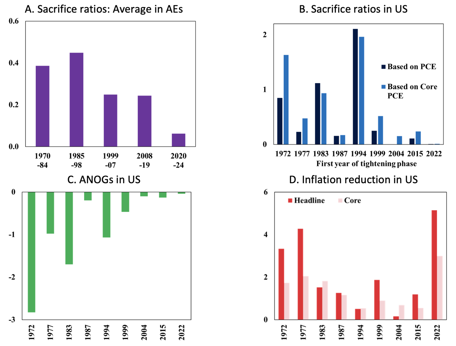 Note: Panels A and B show the ratio of the accumulated negative output gap (in percent of GDP) to the reduction in CPI (or PCE) inflation (in percentage points) from peak to subsequent trough over tightening phases plus 12-month lag in a sample of 24 advanced economies (AEs) (in panel A) or the United States (in panel B). Panel C shows the accumulated negative output gap (ANOG) as a share of GDP over each tightening phase plus a 12-month lag. Output gaps are based on data from Havers using an HP filter. Panel D shows the reduction in headline or core PCE inflation in the US.
