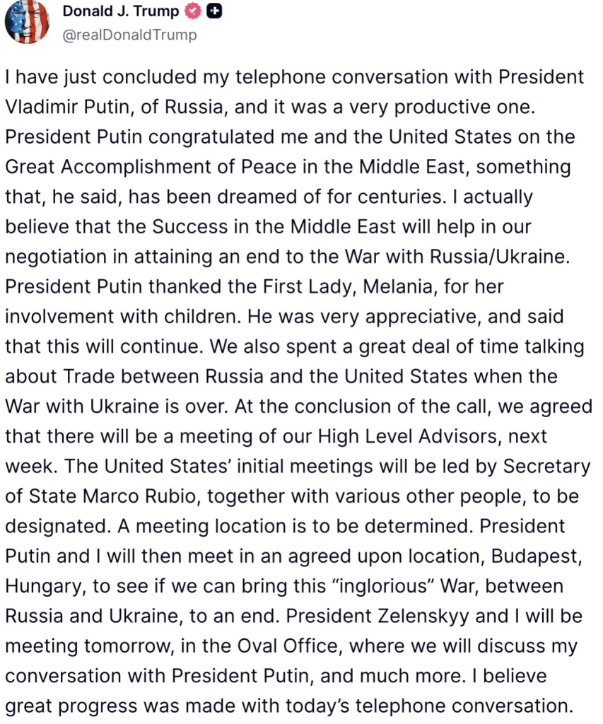 There has been a lot of excited commentary about the Trump-Putin phone call, after which it appears Trump over-hyped the idea that another Trump-Putin summit would happen soon. Not even having seen the kinda-sorta readouts, Douglas Macgregor was of the “prove it to me” school in terms of seeing if this gambit amounted to a meaningful step forward. If you read the Trump statement and the recap of the phone call from Putin’s aide Yury Ushakov, reproduced in full from the Kremlin site at the end of this post, there is indeed much less here than the excited reactions would have you believe. Importantly, the Ushakov remarks make clear that the much-ballyhooed idea of a next summit was discussed but not agreed by the Russian side. Recall also that Trump just claimed in a call with Modi that Modi had agreed to stop importing Russian oil. India issued a tortured-so-as-apparently-not-to-call-Trump-a-liar denial.