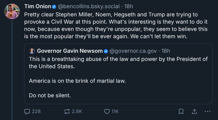 Pretty clear Stephen Miller, [Kristi] Noem, [Pete] Hegseth and Trump are trying to provoke a Civil War at this point. What’s interesting is they want to do it now, because even though they’re unpopular, they seem to believe this is the most popular they’ll be ever again.