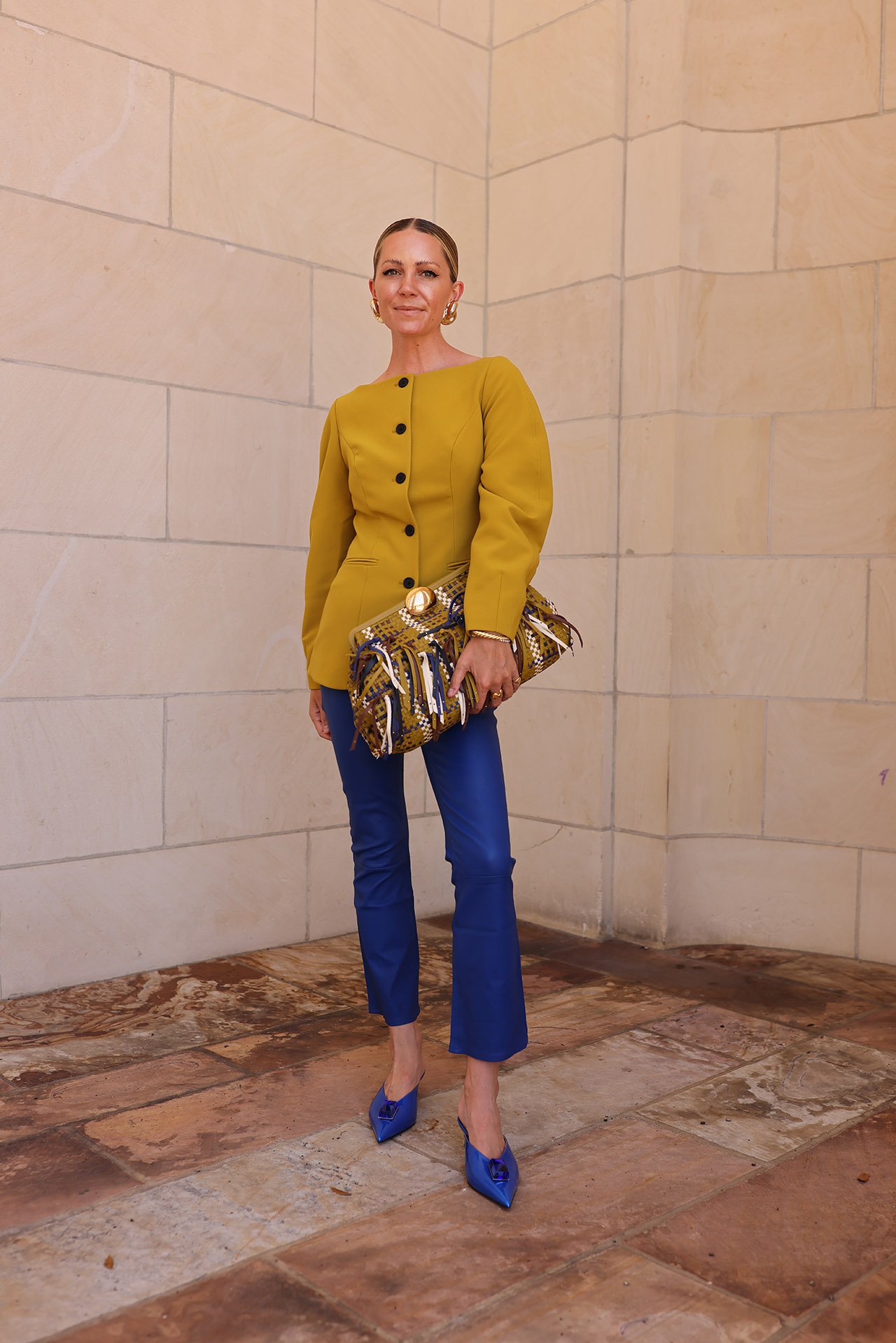 JACKET // BAG // SHOES: Paul Andrew // LEATHER PANTS: Ralph Lauren // EARRINGS