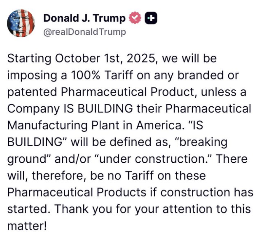 “‘IS BUILDING’ will be defined as, ‘breaking ground’ and/or ‘under construction,’” Trump wrote in a Truth Social post. “There will, therefore, be no Tariff on these Pharmaceutical Products if construction has started.”