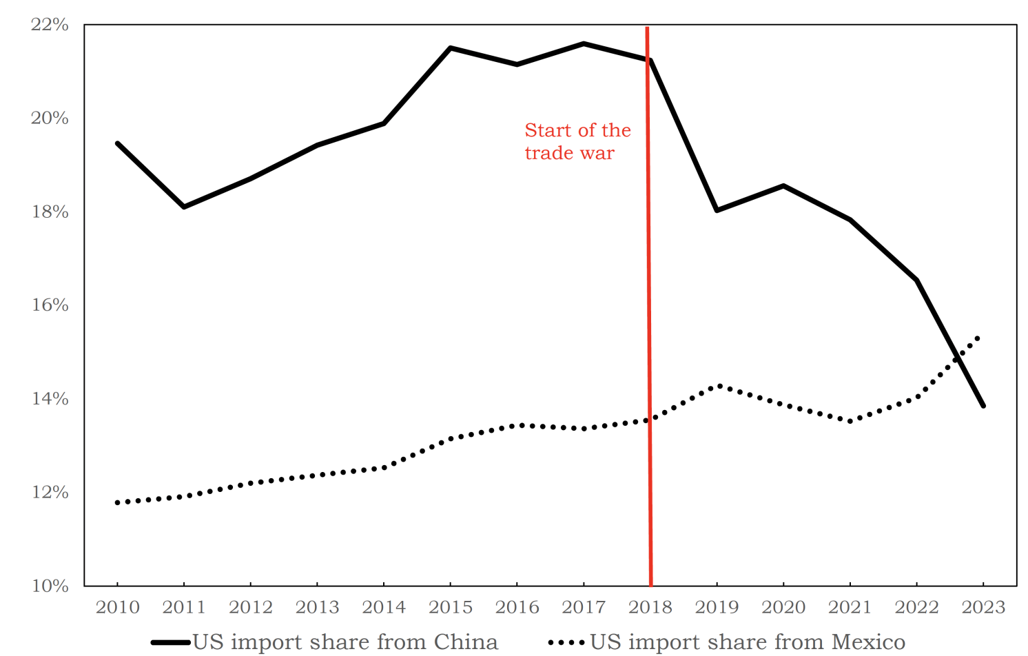 Note: Figure shows US goods imports from Mexico and China as a share of total US imports, 2010–2023.