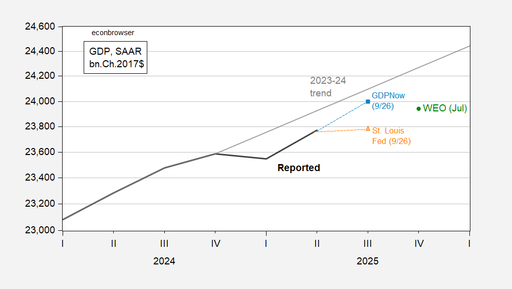 Figure 1: GDP (bold black), 2023-24 stochastic trend (gray), GDPNow (9/26) (light blue square), St. Louis nowcast (9/26) (orange triangle), IMF WEO (July) (green circle). Source: Atlanta Fed, St. Louis Fed, IMF World Economic Outlook, July update, author’s calculations.