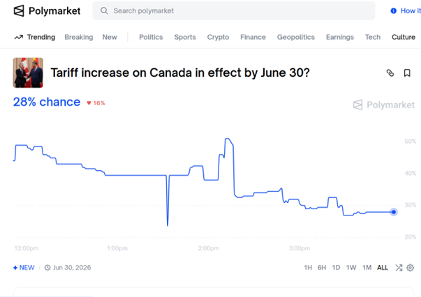 Polymarket is placing some 28% probability on a general tariff rate increase on Canadian imports as of 4pm CT, although there is no calculated probability of a 100% tariff rate being implemented.