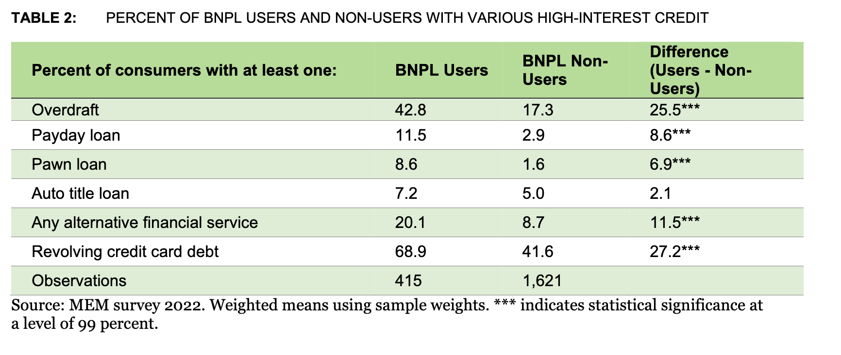 BNPL default rates remain lower than credit cards, likely due to automatic repayment requirements. On average, between 2019-2022, BNPL borrowers defaulted on 2 percent of their BNPL loans.