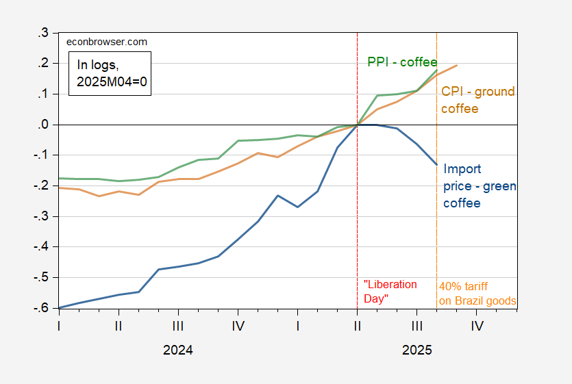 Figure 1: Import price of green bean coffee, n.s.a. (blue), PPI for coffee, n.s.a. (green), price for ground coffee (tan), all in logs, 2025M04=0. Source: BLS via FRED, and author’s calculations.