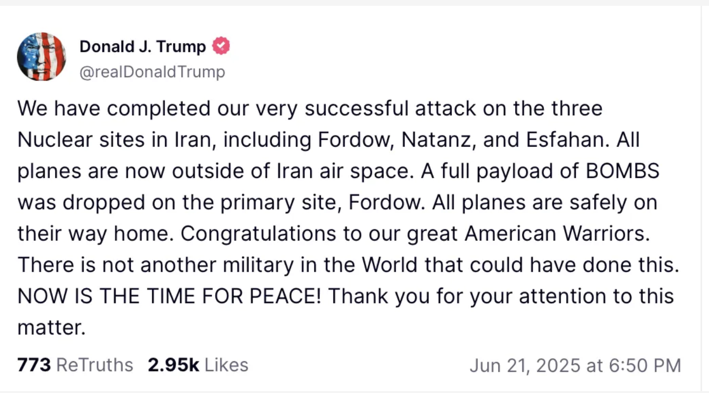 ❗️❗️Trump’s Truth Social post after striking three Iranian nuclear sites!