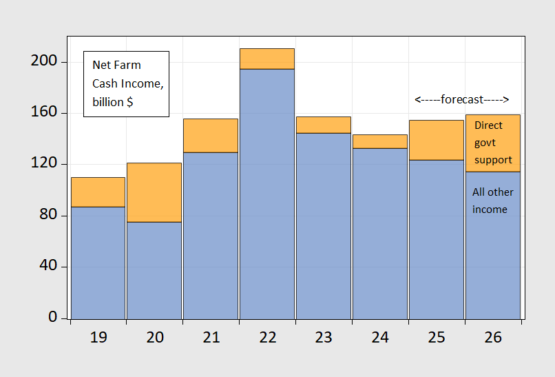 Figure 1:  Farm net cash income from direct government support (tan), all other net cash income (blue), in billions $. Source: USDA,  2/5/2026 version.