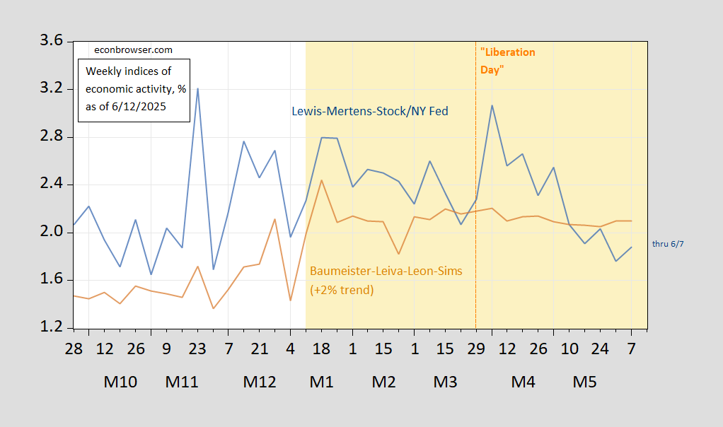 Figure 1: Lewis, Mertens, Stock Weekly Economic Index (blue), and Baumeister, Leiva-Leon, Sims Weekly Economic Conditions Index for US plus 2% trend (tan), all y/y growth rate in %. Source: Dallas Fed via FRED, WECI, accessed 6/12/2025.