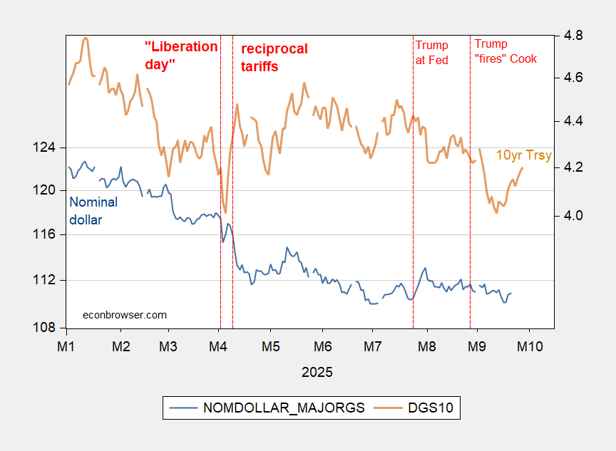So, while I don’t discount completely the idea of illiquidity in the Treasury market as a driver of the increase in Treasury yields around “Liberation Day”, it seems to me that at least part of the shift post-“Liberation Day” is due to the decline in the confidence in the dollar. While the correlation in changes in the dollar’s vale and in the Treasury yield have re-asserted itself, it’s interesting that in Figure 1, the gap that widened in the levels has persisted.