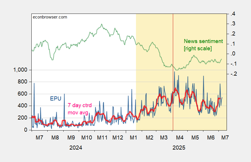Figure 1: EPU (blue, left scale), and centered 7 day moving average (red, right scale), SF Fed News Sentiment index (green). Red dashed line at “Liberation Day”. Source: policyuncertainty.com, SF Fed, and author’s calculations.