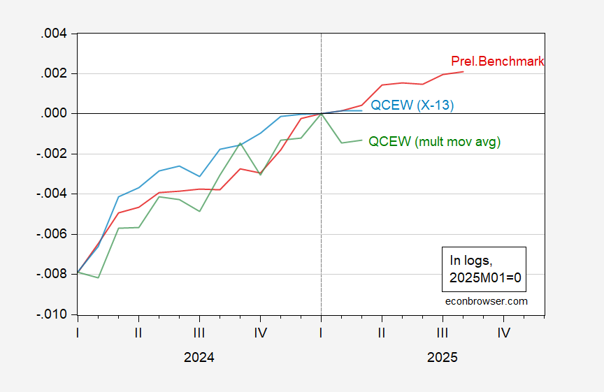 Notice that the implied trajectory for the monthly data associated with the preliminary benchmark “wedges in” equally the average monthly downward revision (911K/12 = 76K). If instead, one looked at the QCEW implied NFP (i.e., use Chow-Lin to construct the actual path of NFP), then THE SLOWDOWN IS IN THE FIRST THREE MONTHS OF THE TRUMP ADMINISTRATION.