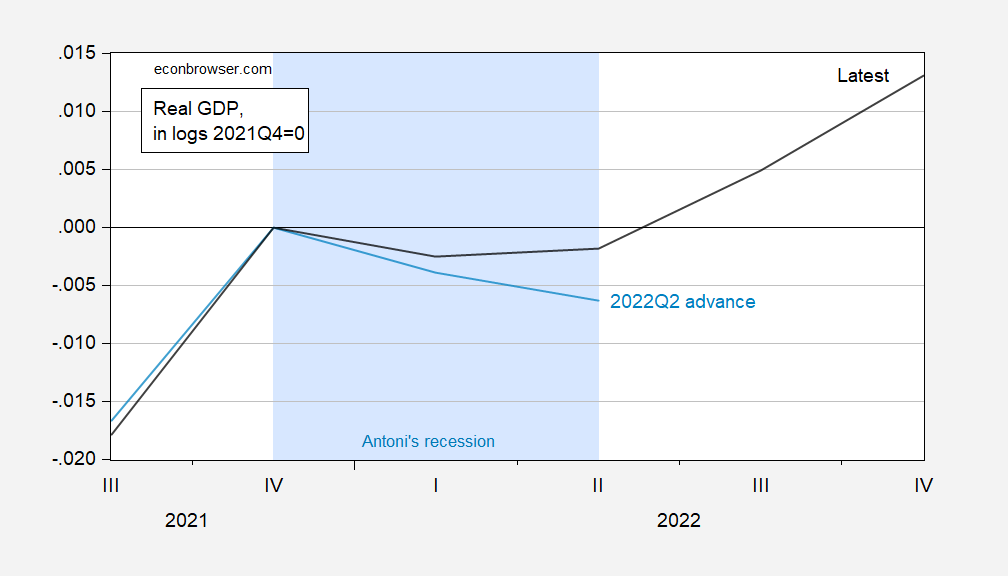 Figure 1: Real GDP from 2025Q2 2nd release (black), and 2022Q2 advance release (light blue), both in logs 2021Q4=0. EJ Antoni’s recession shaded light blue. Source: BEA via FRED, ALFRED.