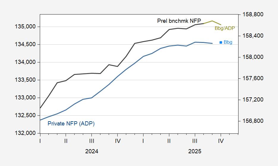 Figure 1: ADP Private nonfarm payroll employment (blue, left scale), Bloomberg consensus implied employment (light blue square, left scale); BLS benchmark-implied nonfarm payroll employment (black, right scale), implied NFP (chartreuse, right scale), all in 000’s, s.a. Source: ADP, BLS via FRED, and author’s calculations.